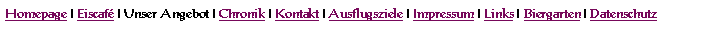 z B. Schokolade, Vanille, Stracciatella, Eierlikör, Málaga, Joghurt / Kirsche, Walnuss, Haselnuss, Engelblau, Pfefferminz, Karamell, Mocca, Erdbeere, Heidelbeere, Zitrone, Banane, Waldmeister, Ananas, Pfirsich, Kiwi, Kokosnuss, Kirsche, Butterkeks, Pinguin und Nougat · über 40 verschiedene Eisbecher · Kuchen und Torten selbst gebacken · heiße und kalte Getränke · leckerer Imbiss für den kleinen Hunger · Kinder können ihren Eisbecher selbst mitgestalten